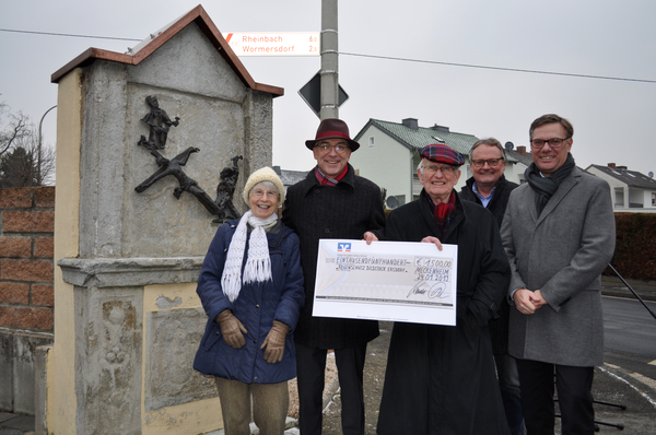 Freuen sich über den neuen Regenschutz am historischen Bildstock in Ersdorf, von links: Dr. Erika Neubauer, Mitglied des Stiftungsvorstandes der Bürgerstiftung Meckenheim, Bürgermeister Bert Spilles, Vorsitzender des Stiftungsvorstandes der Bürgerstiftung Meckenheim, Meinolf Schley-er, erster Vorsitzender des Heimatvereins Meckenheim, Dr. Ferdinand Schmitz, Vorsitzender des Stiftungsrates der Bürgerstiftung Meckenheim, sowie Burkhard Kraus, Mitglied des Stiftungsvorstandes der Bürgerstif-tung Meckenheim.