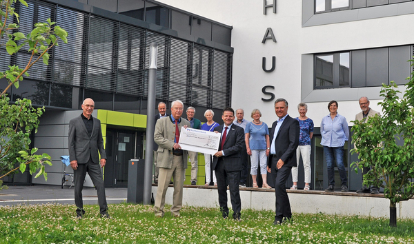 Im Beisein von Bert Spilles (links) und Burchard Kraus (vorne rechts) sowie des Bürgerverein-Vorstandes (im Hintergrund) übergab Jens Biesterfeldt (vorne 2.v.l.) den Scheck an Holger Jung (vorne 3.v.l). Bildquelle: Bürgerstiftung Meckenheim