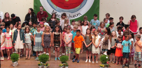 Bei strahlendem Sonnenschein und mittlerweile schon zum dritten Mal hatte die Bürgerstiftung Meckenheim zu einem Chorkonzert von Kinder-chören eingeladen, die dieses Jahr erstmalig von der Schulband der Ge-schwister Scholl Hauptschule unterstützt wurden. Die Schülerinnen und Schüler begeisterten mit einer Vielzahl an Liedern die Zuhörer: So wurde Mozarts kleine Nachtmusik ebenso gesungen, wie unter anderem das Lied von zwei kleinen Wölfen, der selbst arrangierte Limerick „Hickory, Dickory, Dock" und Musicals. Auch spielten Rhythmusgeräte aus Haus-haltsgegenständen eine große Rolle. Eigens gebastelte Masken kamen bei der Aufführung des Liedes vom Andersein auf die Bühne. Alle hatten sichtbar viel Freude und wurden mit viel Beifall belohnt.