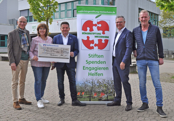 Scheckübergabe vor der Geschwister-Scholl-Hauptschule, von links: Bert Spilles, Marion Schrief, Bürgermeister Holger Jung, Burchard Kraus und Schulleiter Peter Hauck. Bildquelle: Bürgerstiftung Meckenheim