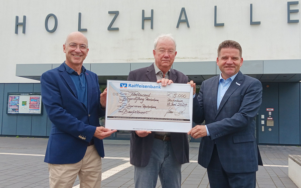 Spendenübergabe vor der Jungholzhalle, von links: Bert Spilles, Mitglied des Stiftungsvorstands der Bürgerstiftung, Jens Biesterfeldt, erster Vorsitzender des Bürgervereins Meckenheim, und Bürgermeister Holger Jung, Vorsitzender des Stiftungsvorstands der Bürgerstiftung. Bildquelle: Bürgerstiftung Meckenheim