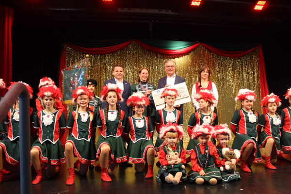 Holger Jung, Sandra Schüller (Stadtgarde Meckenheim), Burchard Kraus und Bettina Ammermann (Stadt Garde Meckenheim). Außerdem ist die Kinder- und Jugendgarde der Stadt Garde Meckenheim zu sehen. Bildquelle: Bürgerstiftung Meckenheim